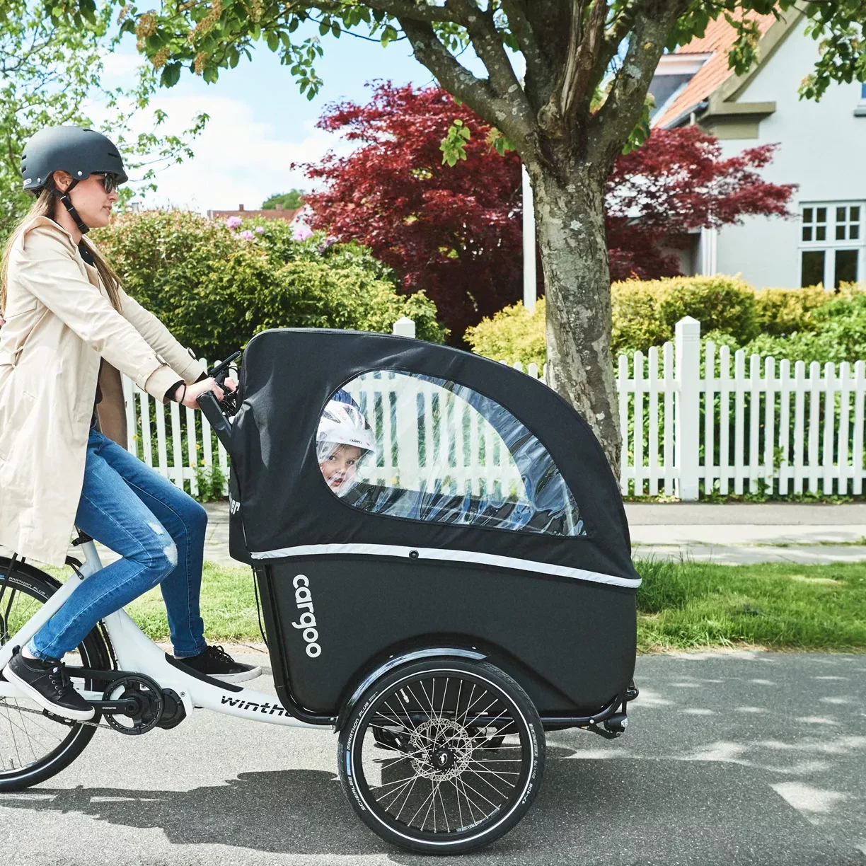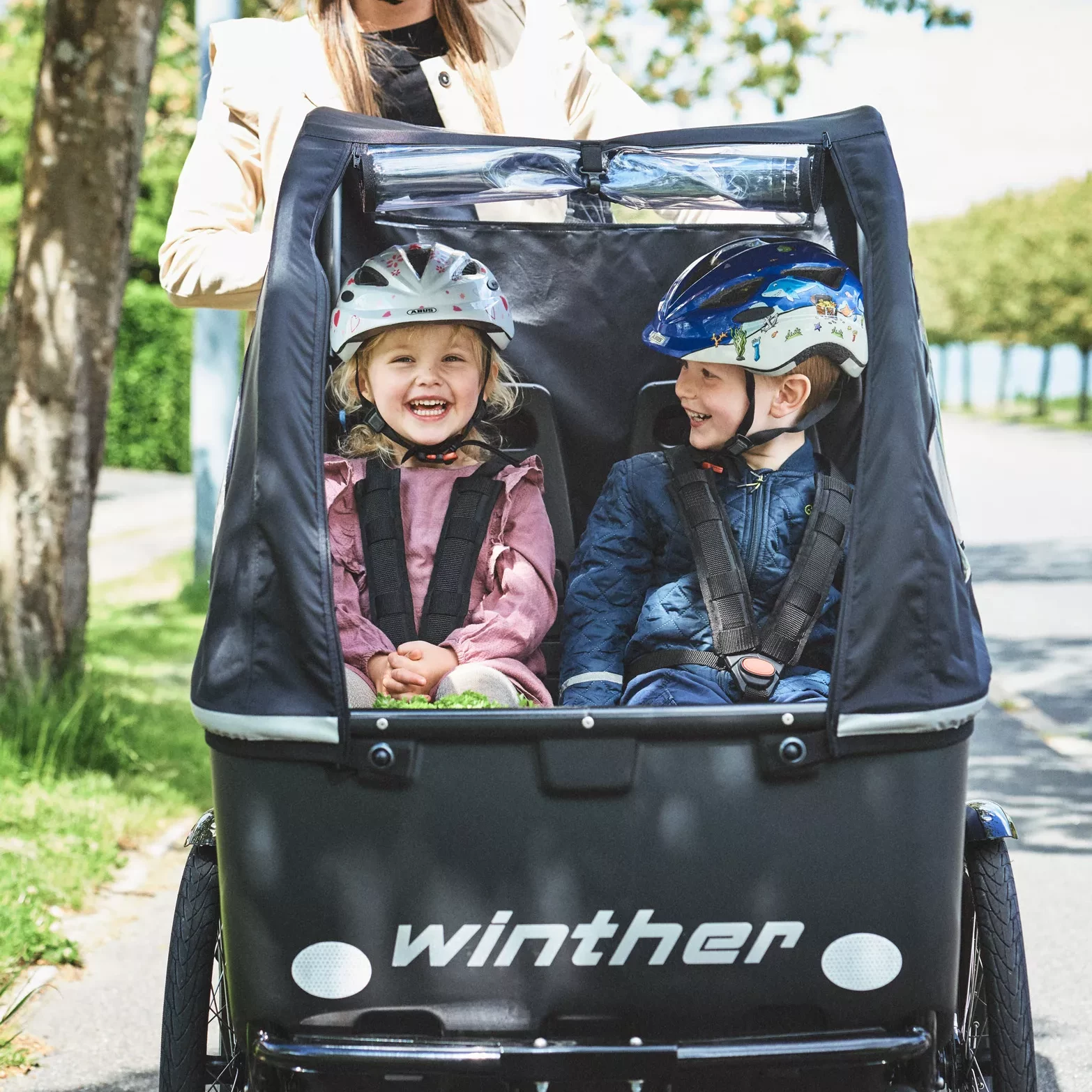 Das Cargoo ist das flexibelste Lastenfahrrad von Winther. Es besitzt eine 278 Liter große Kabine, was dem Gepäckraum eines Klein- bis Mittelklassewagens entspricht, und kann bis zu 100 kg aufnehmen. Die Kabine bietet üppig Platz für Kinder, Gepäck und Einkäufe. Sie bietet bis zu vier Kindern in der Box mit verstärktem Frontrahmen Platz. Du kannst aus einer Vielfalt an Sitzoptionen wählen. Wenn du kleine Kinder hast, erleichtert die ISOFIX-Konsole das Leben beim Wechsel zwischen verschiedenen Transportmodi. Nimm einfach den ISOFIX-Autositz aus deinem Auto und setze ihn in dein Cargoo – und umgekehrt. Oder möchtest du deinen Partner oder deine Partnerin mitnehmen? Dann wähle unsere Familienbank, die von Kindern und Erwachsenen gemeinsam genutzt werden kann. Es gibt so viele Optionen, die du entsprechend deinem Bedarf umsetzen kannst!